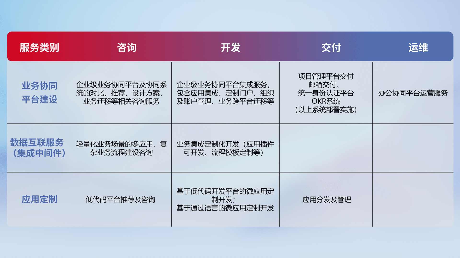 针对钉钉、、企微、、、IDaas等平台级产品提供产品的规划、、、、方案、、、、交付、、定制化开发等服务,,,实现如统一协同办公、、、、智能客户服务、、、混合会议管理、、、、智能数据查询、、、、等业务场景,,,,实现数字化转型。。。。