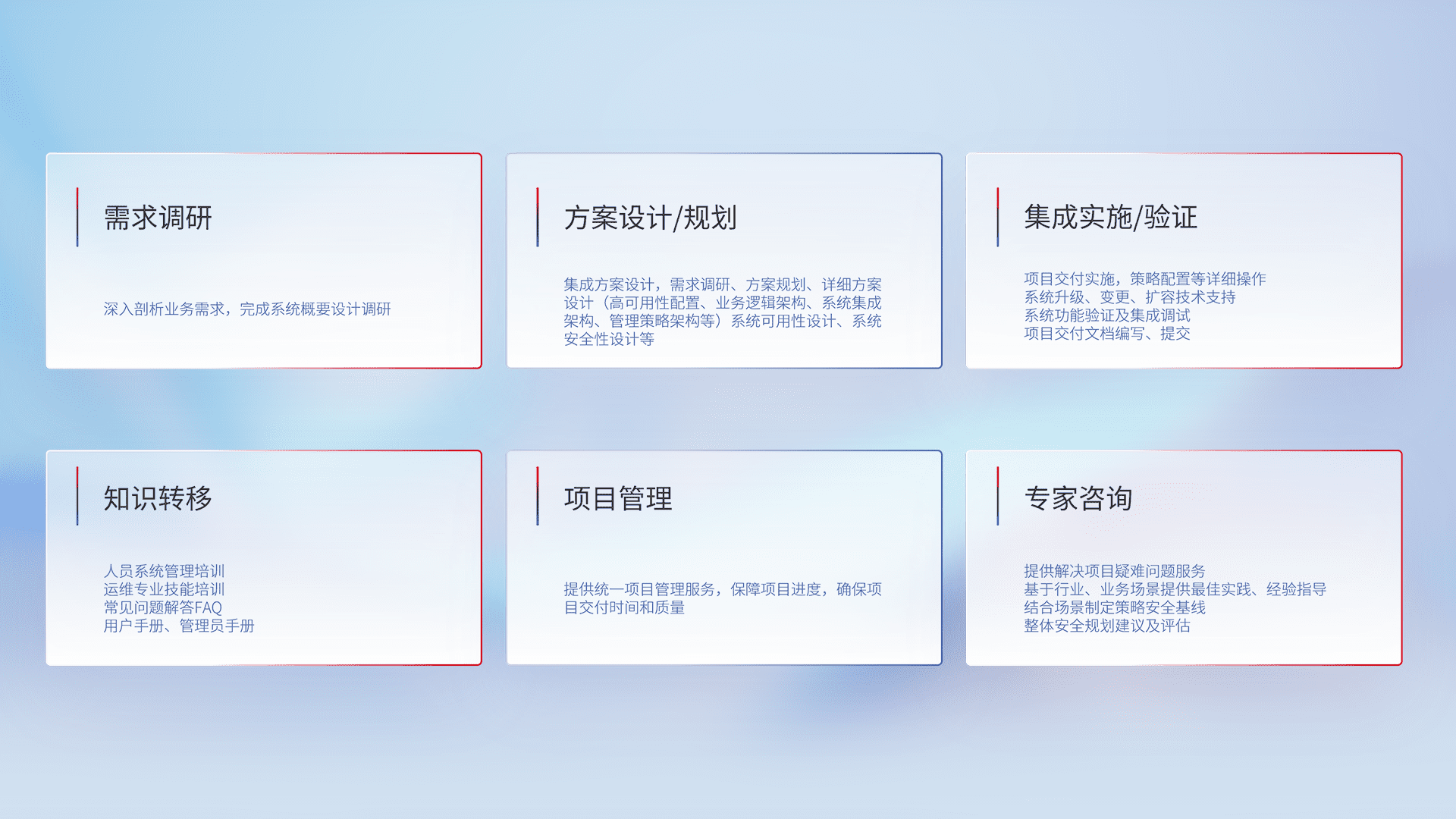 针对客户行业特性,,,将宏观的安全战略和需求,,,通过专业的交付服务,,,,实现项目落地,,,为客户提供标准规范的集成交付服务。。